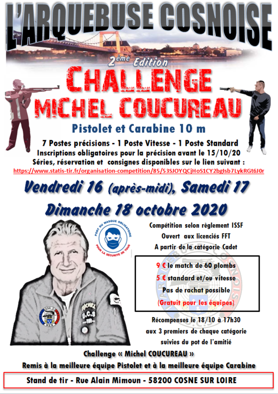 Nous organisons notre 2éme challenge Michel COUCUREAU. Il se déroulera les 16,17 et 18 octobre 2020 au stand rue Alain MIMOUN à COSNE SUR LOIRE Ce challenge sera un peu particulier, les conditions sanitaires nous obligent à réduire drastiquement les pas de tir. Il n'y aura que sept pas de tir précision pour les pistolets et carabines. Nous aurons un poste vitesse et un poste précision.Il est obligatoire de s'inscrire pour la précision. Pour les séries vitesse nous gérerons au mieux les compétiteurs.